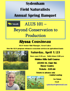Spring is just around the corner; you know what that means, our annual Banquet is fast approaching. Our special Guest Speaker will be ALUS Senior Hub Manager, Great Lakes, Alyssa Cousineau.